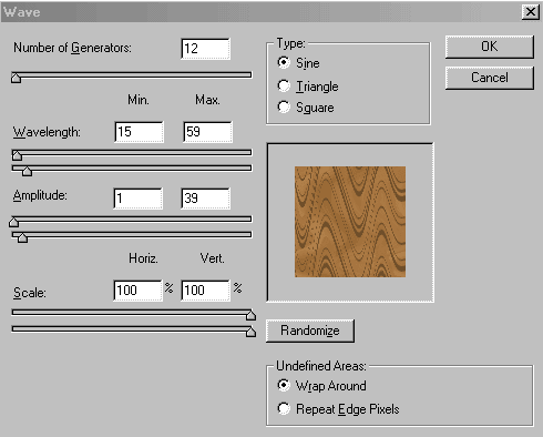 Теперь потребуется применить к нарисованным полоскам искажение Wave («Волна»): Filter→Distort→Wave (Фильтр→ИскажениеаВолна), установив подходящие параметры волны например как на рис. 49. В результате вы получите изображение, как на рис. 50.