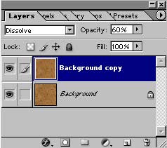 После этого сделайте копию оставшегося единственного слоя Background copy, установите для него режим Dissolve, а параметр Opacity сделайте равным 60% (рис. 51 и 52). Затем на слое Background copy примените фильтр Filter→Blur→Gaussian Blur (Фильтр→Размытие→Размытие по Гауссу) со значением в 6 пикселов, чтобы имитация была более реальной (рис. 53).