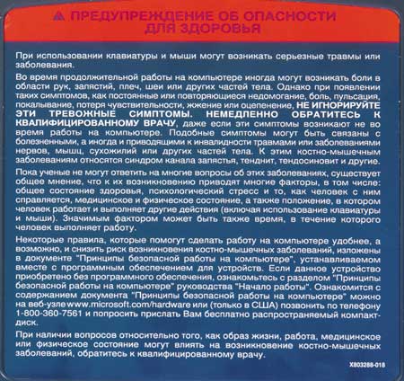Но главная особенность данной клавиатуры — это предупреждающая надпись на обратной стороне корпуса. Текст довольно длинный, но смысл сводится к следующему. Если вы используете клавиатуры Microsoft, то у вас могут возникнуть серьезные проблемы со здоровьем и в этом случае вам надлежит обращаться к квалифицированному врачу!