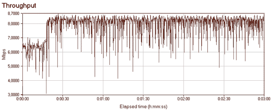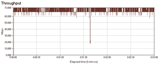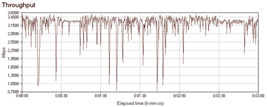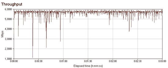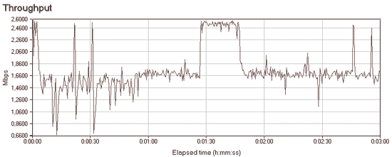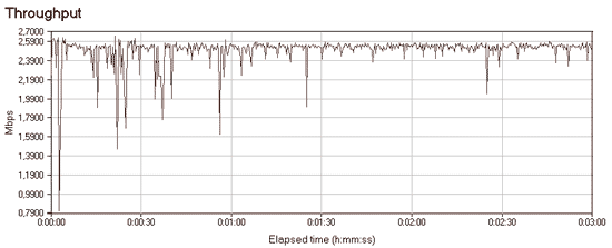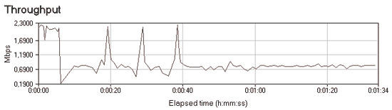 В этом тесте измерялась скорость передачи данных между клиентом и компьютером, который имитировал внешний сервер. Компьютер-клиент подключался к одному из LAN-портов концентратора. С помощью стандартных процедур операционной системы (Windows XP) создавалось подключение VPN. В настройках шифрование канала MPPE было отключено. Сервером для этого соединения выступал концентратор доступа D-Link DSA-3110. После подключения к серверу и установки соединения на компьютере-клиенте были запущены консоль Ixia Chariot 5.4 и скрипт Throughput.scr. Таким образом, трафик проходил через PPTP-туннель. На рис. 4 показано графическое отображение результата этого теста.