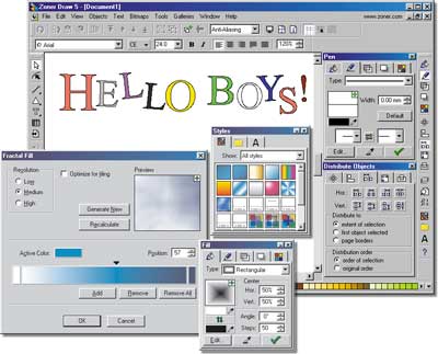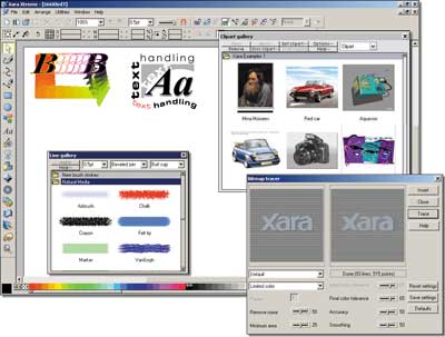 Xara Xtreme предоставляет удобные инструменты для создания и редактирования любых векторных контуров, начиная от примитивов и заканчивая самыми замысловатыми формами, в том числе автоматически сглаживаемыми. Контуры могут иметь обычную границу либо оформляться при помощи кистей, набор которых входит в поставку и может быть расширен за счет редактирования встроенных или создания пользовательских. Заливка может быть как сплошной, так и текстурной, градиентной или фрактальной. Созданные контуры несложно группировать и трансформировать в соответствии с выбранным вариантом деформации. Инструменты работы с текстом позволяют создать текстовые объекты — в дальнейшем их можно редактировать не только на уровне текста, но и как векторные контуры, размещать вдоль любой кривой, задавать обтекание текстом графических объектов или вписывать его в указанные контуры, оформлять текст при помощи градиентных и текстурных заливок и т.д. Кроме того, в поставку пакета входит целая галерея клипартов, элементы из которой также можно задействовать в процессе подготовки иллюстраций.