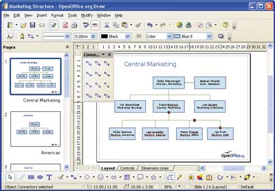 OpenOffice.org Draw позволяет создавать векторные объекты на базе векторных примитивов, а также ломаных и кривых. При необходимости объекты можно связать специальными соединительными линиями, которые прикрепляются к точкам соединения на объектах, перемещаются вместе с ними и незаменимы, например, при рисовании блок-схем. Возможно создание текстовых объектов, правда для них предусмотрены лишь базовые настройки (шрифт, размер, начертание, выравнивание и т.п.). Для оформления объектов им назначают заливку и границу, настраивают тени и прозрачности. Заливка может быть однотонной, текстурной, градиентной или узорной, причем градиенты и узоры можно создавать самостоятельно. Для границ и теней предусмотрено изменение только основных параметров (цвета и толщины/ширины), а для прозрачности возможно регулирование не только степени применения эффекта, но и типа прозрачности, что позволяет применять эффектные полупрозрачные градиенты. Все названные параметры могут сохраняться в редактируемых стилях оформления.