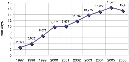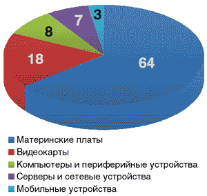 Основу широкого ассортимента концерна Gigabyte Group составляют материнские платы. Так, в 2006 году объем продаж материнских плат достиг 65% от общего объема продаж продукции Gigabyte Group (рис. 1) и в численном выражении составил 15,4 млн штук (рис. 2).