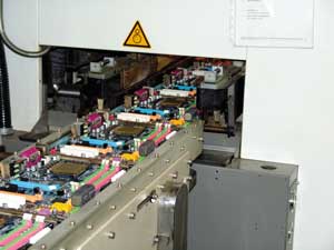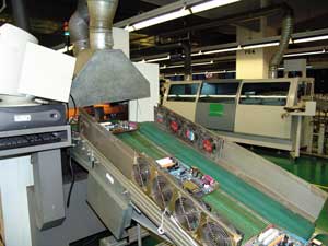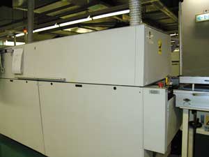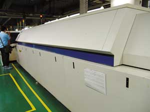 После установки на плату микросхем в автомате Middle Speed Mounter материнские платы поступают в специальную печь (Reflow Oven Heller 1600 SX) — рис. 8, где разогреваются (причем разогрев происходит по точно заданному шаблону, чтобы избежать перегрева отдельных участков), а установленные на плату элементы припаиваются.