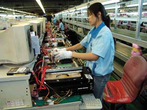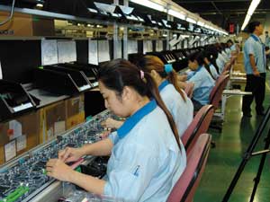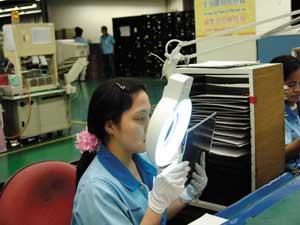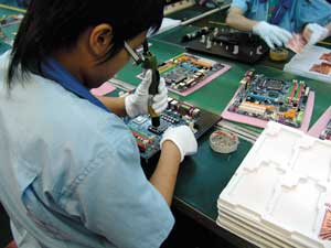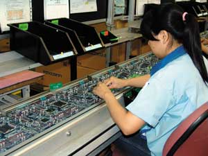 Если в цехе SMT-монтажа работает всего несколько человек, занимающихся контролем работы автоматов, то в цехе DIP-монтажа куда более многолюдно (рис. 14), причем работают одни женщины, в основном филиппинки (это обходится компании дешевле).