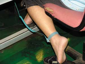 Интересно отметить, что каждая девушка, сидящая за конвейером, в буквальном смысле привязана к нему за ногу (рис. 16). Конечно же, это делается не для того, чтобы повысить производительность труда. Просто таким образом все работающие «заземляются» для снятия статического электричества.
