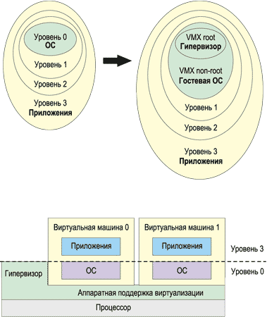 Как уже отмечалось, процессоры с архитектурой x86 не поддерживают виртуализацию на аппаратном уровне и для ее реализации применяются различные программные ухищрения. Тем не менее такая ситуация сохранялась вплоть до 2005 года, когда компания Intel разработала аппаратную поддержку виртуализации в своих новых процессорах. Данная технология, получившая название Intel VT-x (кодовое название Vanderpool), поддерживается практически всеми (за исключением младших моделей) новыми процессорами Intel семейства Intel Core 2 Duo и процессорами семейства Intel Core 2 Quad.