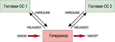 Для гостевой операционной системы предусмотрено выполнение кода VMX-non-root. Для программного кода VMX-non-root взаимодействие гостевой операционной системы с процессором происходит посредством гипервизора. То есть вместо того, чтобы исполнять некоторые инструкции, в коде VMX-non-root будут осуществляться выход из виртуальной машины и передача управления гипервизору. Эти переходы остаются невидимыми для самого VMX-non-root кода, что позволяет гипервизору полностью контролировать ресурсы физического компьютера или предоставлять доступ к ним из гостевых ОС. Отметим, что VMX-режим для кода VMX-non-root не требует каких-либо модификаций гостевой ОС.
