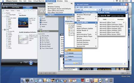 VMware Fusion (рис. 7) — средство управления виртуальными машинами для Mac OS X версий 10.4.9 и выше, позволяющее использовать в качестве гостевых операционных систем 32- и 64-разрядные версии Windows (включая Windows Vista Business, Enterprise, Ultimate, Windows XP, а также Sun Solaris и некоторые версии Linux). Данный продукт позволяет виртуальным машинам применять два процессора, обращаться к устройствам USB 2.0, выполнять на виртуальных машинах приложения, использующие библиотеки трехмерной графики DirectX 8.1 (например, игры).