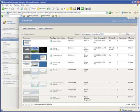VMware Lab Manager (рис. 9) — инструмент для управления виртуальной инфраструктурой и конфигурациями, предназначенный для тестовых лабораторий. Он позволяет создавать библиотеки конфигураций виртуальных машин и осуществлять тестирование конфигураций программного обеспечения без развертывания на реальных серверах, что делает этот продукт полезным в проектах внедрения информационных систем или при модернизации ИТ-инфраструктуры. Данный продукт обладает и программным интерфейсом, позволяющим создавать решения на его основе.