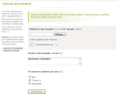 Через онлайновую форму (до 30 снимков одновременно), архивом или в режиме быстрой загрузки (сразу папки или группы файлов). Возможна загрузка с мобильного телефона (MMS) |