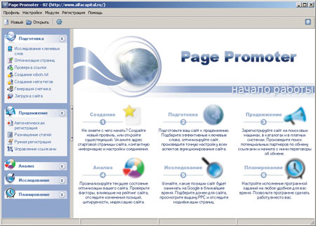 Page Promoter — комплексный инструмент для эффективного анализа, продвижения и управления интернет-проектами, обеспечивающий все этапы продвижения сайта, начиная от подбора доменного имени, поиска эффективных ключевых слов и оптимизации страниц сайта и заканчивая анализом и мониторингом результатов проделанной работы. Все отчеты, создаваемые в процессе анализа сайтов, могут быть распечатаны, экспортированы в форматы HTML, MHT и XLS либо отправлены на указанный электронный адрес. Возможно автоматическое выполнение мониторинга сайтов по расписанию с помощью встроенного планировщика заданий. Пакет выпускается в пяти редакциях: бесплатной (распространяемой в качестве демо-версии, функциональность которой крайне ограничена) и платных «Стандарт», «Профессионал», «Эксперт» и «Эксперт Москва». Каждая последующая версия включает все утилиты предыдущих и обладает какой-либо дополнительной функциональностью (табл. 1). Редакция «Эксперт Москва» отличается от редакции «Эксперт» наличием услуги «Обучение», предполагающей два выезда специалиста в офис для индивидуального обучения основам поискового продвижения сайта.