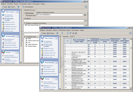 Все модули пакета Page Promoter разбиты на пять групп: «Подготовка», «Продвижение», «Анализ», «Исследование» и «Планирование» (рис. 1). В группе «Подготовка» сосредоточены инструменты, предназначенные для проведения подготовительных работ со страницами сайта и его предварительной оптимизации. Данный инструментарий позволяет подобрать эффективные ключевые слова и словосочетания, проанализировать текстовое наполнение и HTML-код страниц с точки зрения оптимизации под конкретные поисковые машины (рис. 2), получить точную информацию о частоте ключевых слов, а также рекомендации по устранению проблем, которые могут возникнуть при индексации страниц поисковыми роботами. Кроме того, в данной группе имеются модули для выявления на сайте неработающих ссылок, визуального редактирования файла robots.txt и метатэгов, подсчета текущей посещаемости сайта и загрузки любых файлов и папок сайта по FTP на web-сервер.