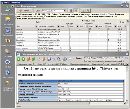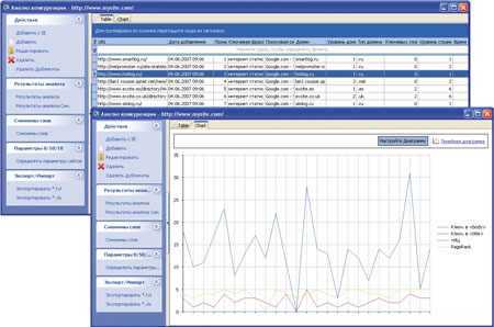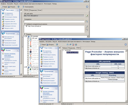 Группа «Анализ» объединяет инструменты для проверки и мониторинга результатов работы по продвижению сайта. С их помощью можно провести анализ внешних факторов популярности (позволяет определить такие факторы популярности сайта, как различные индексы цитирования, наличие сайта в каталогах и рейтингах, а также параметры Alexa Traffic Rank, Alexa Traffic Change и др. — рис. 3) и отследить внешние ссылки. А также проверить позиции сайтов на основных поисковых машинах по определенным ключевым запросам (рис. 4), сравнить рейтинг исследуемого сайта с рейтингом конкурентов, провести анализ индексации страниц сайта, установить частоту и распределение ключевых слов с учетом морфологии русского языка, определить параметры популярности (PR, количество ссылающихся страниц) и т.п.