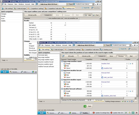 Web CEO — полнофункциональное решение для оптимизации и продвижения сайтов, рассчитанное как на владельцев интернет-проектов и web-мастеров, так и на специалистов в области оптимизации. Оно позволяет не только отслеживать позиции своего проекта в поисковых системах по нужным запросам и проводить сравнительный анализ сайтов-конкурентов, но и подбирать ключевые слова для его продвижения, анализировать содержимое сайта на предмет наличия битых ссылок, следить за доступностью ресурса для посетителей и осуществлять поиск партнеров для обмена ссылками. Web CEO предоставляет для анализа более 160 видов отчетов, которые в коммерческих версиях продукта могут быть распечатаны, экспортированы в форматы HTML, MHT и XLS либо отправлены на указанный электронный адрес. Пакет выпускается в трех редакциях: бесплатной Free и платных SmallBiz и Professional. Краткая сравнительная характеристика версий приведена в табл. 2, более детальное сравнение доступно по адресу: http://www.webceo.com/pricing/comparison-chart.htm. Стоит отметить, что функциональность бесплатной версии вполне достаточна для продвижения сайтов малых компаний и любительских или иных некоммерческих проектов.