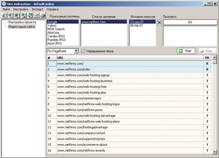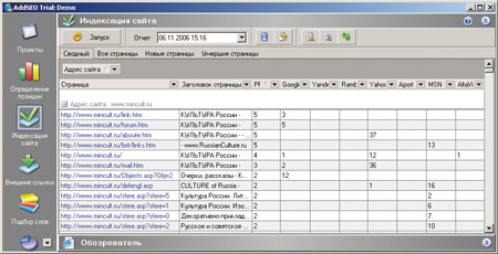 Модуль «Определение позиций» позволяет установить позиции, занимаемые сайтом в поисковых системах по выбранным ключевым словам. При этом из российских поисковиков поддерживаются Яндекс, Рамблер, Апорт, а также Google.ru, Mail.ru, Km.ru и WebAlta.ru, а из международных — Google, Yahoo, MSN, AltaVista и др. (всего более 30). Модуль «Внешние ссылки» выявляет внешние ссылки на указанный ресурс и помогает отслеживать их динамику (определять новые и устаревшие ссылки) — рис. 10, а также анализировать конкурентов и искать тематические ресурсы для обмена ссылками. Модуль «Индексация сайта» обеспечивает проверку индексации страниц сайта поисковыми системами (рис. 11). Модуль «Обмен ссылками» поможет в поиске ресурсов, подходящих для размещения ссылки на проект, проверки партнерских ссылок и управления купленными/проданными/обменными ссылками. Лог-анализатор позволит оценить посещаемость ресурса на основе анализа лог-файлов. С помощью Page Rank-анализатора несложно автоматически определить значения показателя Google PageRank, тематический индекс цитирования Яндекс (тИЦ4 ), число внешних ссылок и присутствие в каталогах Яндекса, DMOZ и Yahoo для заданного списка веб-адресов. HTML-анализатор позволит вычислить вес и плотность ключевых слов на странице и выявить ключевые фразы и словосочетания и потому может быть использован как для предварительного анализа собственного проекта, так и для анализа конкурентов. Модуль «Подбор ключевых слов» поможет подобрать релевантные ключевые слова и оценить по ним уровень конкуренции сайта. Модуль «Google дата-центры» будет полезен при активной работе с поисковой системой Google для проверки позиций на дата-центрах. Модуль «Работа со сниппетами» позволит вести историю и анализ описаний, выдаваемых для исследуемого ресурса поисковыми системами.