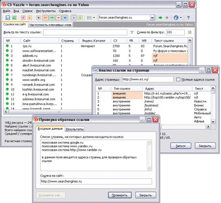 С помощью CS Yazzle несложно провести комплексную оценку позиций сайта (рис. 12) и определить для него значения параметров Alexa Rank, Google PR, тИЦ (CY) и Webalta Rank, узнать количество страниц сайта в индексах Alexa, Google, MSN, Rambler, Webalta, Yahoo и Yandex, выявить рубрики каталогов DMOZ и Яндекс.Каталог, в которых данный ресурс описан (если, конечно, описан), и т.д. Это решение помогает также осуществить подбор ключевых слов и фраз по данным статистики поисковых систем, установить позиции исследуемого сайта, число проиндексированных у него в поисковых системах страниц, провести анализ перспективности продвижения и раскрутки сайта по тому или иному запросу и даже определить ориентировочную стоимость продвижения сайта в Яндексе. Кроме того, в CS Yazzle реализован широкий функционал по работе с внешними ссылками (рис. 13). Например, программа позволяет выявить имеющиеся в поисковых системах списки ссылок на сайт с их подробными характеристиками (IP-адрес, имя владельца домена, рубрика Яндекс.Каталога, значение тИЦ, значение Google PR, величина Webalta WR, текст ссылки, с какой страницы сайта (главной или нет) она ведет и т.д.), а также провести анализ ссылочной массы для прогнозирования будущих значений Google PR и тИЦ, определить показатели произвольного списка страниц для оценки перспективности покупки ссылок, проверить наличие ссылок по указанному списку страниц, получить список обратных ссылок для их анализа и т.д.
