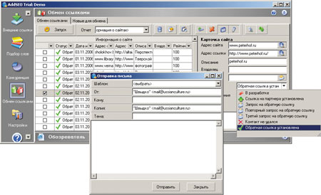 AddSEO позволяет отслеживать позиции сайта в результатах поиска по выбранным ключевым фразам, а также контролировать уровень индексирования страниц сайта поисковыми системами путем отслеживания PR-страниц, выявления вновь проиндексированных страниц, а также получения информации о страницах, удаленных из базы поисковых систем (рис. 14). С помощью данной программы несложно отследить все внешние ссылки на сайт и проанализировать актуальность и релевантность семантического ядра продвигаемого сайта и сайтов-конкурентов. Кроме того, AddSEO представляет полную картину конкуренции по заданному семантическому ядру (рис. 15), что позволяет оценить эффективность выбранной стратегии по продвижению сайта, принять решение об изменении семантического ядра, а также при необходимости пересмотреть отношения с партнерскими сайтами или с сайтами-конкурентами. Входящий в поставку менеджер обмена ссылками значительно упрощает процесс контроля за ссылками (рис. 16) и позволяет добавлять/удалять их с введением полной информации о каждой из ссылок, автоматизировать процесс обмена ссылками, вести учет и контроль покупных ссылок и т.д.