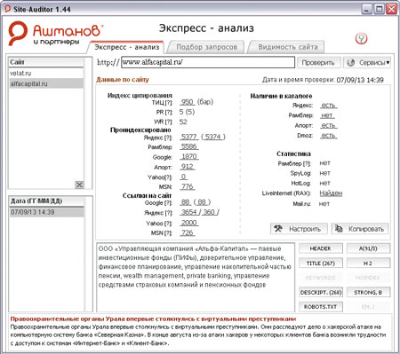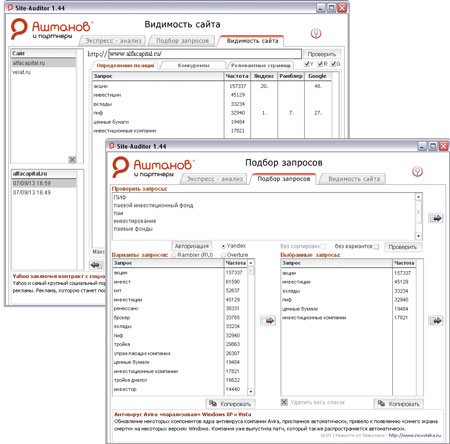 Утилита Site-Auditor предназначена для всестороннего анализа видимости сайта в Интернете и в силу свой бесплатности, а также простоты использования представляет интерес для владельцев любительских интернет-проектов. С ее помощью можно быстро собрать информацию, позволяющую оценить видимость проекта как в российском сегменте Интернета на поисковиках Яндекс, Рамблер и Апорт, так и в наиболее популярных международных сервисах Google и Yahoo. При этом все собираемые данные сохраняются на компьютере, что позволяет в дальнейшем отслеживать историю изменений.