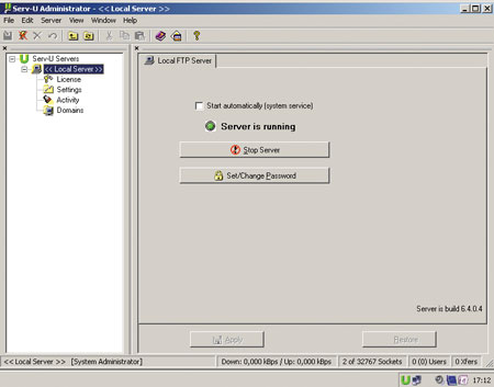 После выполнения всех указаний Wizard FTP-сервер Serv-U автоматически запустится (рис. 1). Административную консоль можно свернуть в трей. Если никаких неполадок при запуске не произошло, буква «U» будет зеленой. Выключенный FTP-сервер отображается перечеркнутым значком, а наличие подключенных клиентов — темно-синей буквой «U».