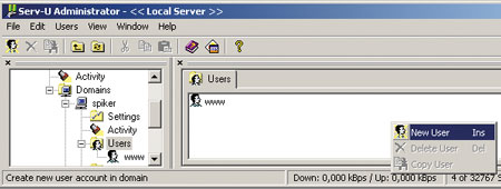 По умолчанию аккаунт анонимного пользователя включен, все настройки для него определяются установками в закладке Settings конкретного домена (псевдосервера). Чтобы создать уникального пользователя, который имел бы доступ только к определенным каталогам и файлам, необходимо во вкладке Users щелкнуть правой кнопкой мыши и выбрать New user (рис. 3). После этого запустится Wizard, с помощью которого устанавливаются основные настройки: имя пользователя, пароль и корневой каталог.