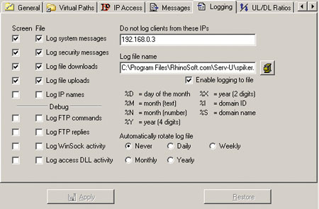 Сервер Serv-U поддерживает многоуровневое протоколирование служебной информации. Все записи сохраняются в едином файле с расширением *.log. Пользователь может настроить сообщения, которые будут прописаны в файле в меню Logging (рис. 5).