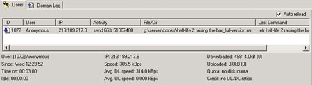 При необходимости можно воспользоваться опцией слежения за пользователем (Spy on user). С ее помощью можно полностью проследить «движение» пользователя по FTP-серверу, просмотренные и скачанные файлы, а также суммирующий трафик. Функция слежения работает исключительно по IP-адресу и текущей сессии, следующая сессия этого пользователя уже не будет отображаться в меню просмотра.