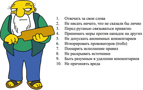 Естественно, что блогосфера будет жить и развиваться и безо всяких правил. Правила общения создаются самим сообществом, а О’Рейли просто попытался их сформулировать для тех, кто еще не определился с манерой поведения в Сети.