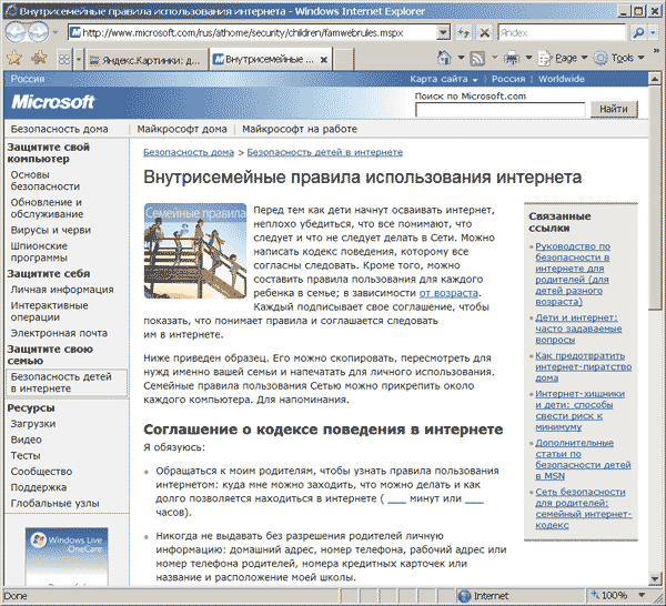 Причем по приведенному образцу предлагается написать собственный семейный кодекс поведения, которому согласятся следовать все домашние. Правила использования Интернета можно написать для каждого ребенка в семье в зависимости от возраста. На соответствующей странице на сайте компании (http://www.microsoft.com/rus/athome/security/children/famwebrules.mspx) предлагается образец такого соглашения.