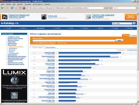 Свой рейтинг интереса читателей к тем или иным фотоаппаратам ведут специализированные фотосайты Digital Photography Review (http://www.dpreview.com/reviews/stats.asp), Image Resource (http://www.imaging-resource.com/WB/WB.HTM?view=10), Photography Review (http://www.photographyreview.com/defaultcrx.aspx) и Digital Camera Info (http://www.digitalcamerainfo.com/ratings.php?ratingsGroup=SLR). Они не всегда удобны в использовании, но, как правило, хорошо отражают интерес профессионалов и увлеченных фотолюбителей, то есть безусловно являются репрезентативными выборками. Существуют и отечественные подобные ресурсы — например DC Photo (http://www.dcphoto.ru/bestofthebest.phtml?sw=3), где можно узнать, скажем, что за последний месяц самыми популярными камерами у российских фотолюбителей были зеркалки Canon EOS 40D (интерес — 16%), Samsung Pro 815 (14%), дорогущий Canon EOS 5D (10%) и Canon PowerShot Pro 1. За ними следуют более или менее доступные широкому кругу пользователей аппараты, такие как Olympus C-40Z, Sony CyberShot DSC-F828 или Canon PowerShot S2 IS. В общем, не очень понятный рейтинг, поскольку многие фигурирующие в нем камеры сильно устарели,—возможно, он основывается на информации, взятой из заголовков присланных снимков, о чем мы поговорим далее (информации о методике составления рейтинга на сайте DC Photo найдено не было).