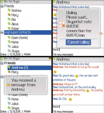 Таким образом, программа обладает полноценными возможностями клиента Skype — с ее помощью можно обмениваться сообщениями, отправлять и получать файлы, а также совершать звонки. В текущей версии поддерживаются только звонки по системе SkypeOut, но в планах разработчиков — реализация поддержки звонков и на постоянный номер в сети Skype (SkypeIn), а в перспективе — полноценная поддержка всех возможностей Skype. Причем звонки из среды Skype с мобильного телефона любому находящемуся в сети участнику проекта Skype станут бесплатными. К недостаткам программы можно отнести только необходимость запуска Skype-клиента на настольном компьютере.