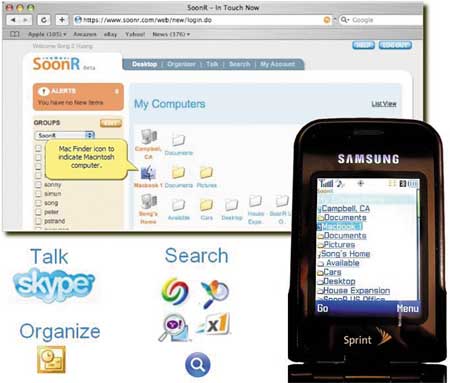 Интересный сервис для Skype-телефонии предлагает американская компания SoonR (http://www.soonr.com/). Ее мобильный клиент SoonR Talk позволяет удаленно управлять компьютером с мобильного устройства, а также использовать телефон для общения в среде Skype.
