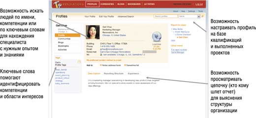 Через пользовательские профили можно предоставлять доступ к совместным закладкам, сообществам, сообщениям в блогах и общим проектам. В функцию Profiles входит должностная иерархия, помогающая находить руководителей пользователей и устанавливать структуру организации.