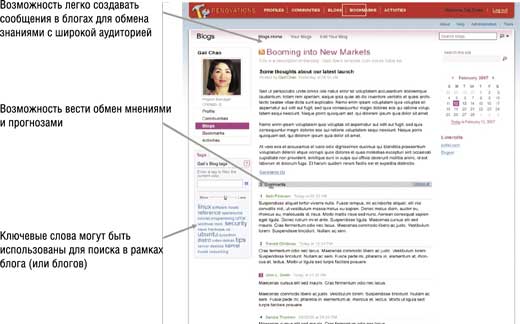 Blogs упрощает поиск информации в блогах благодаря интегрированным инструментам поиска. Кроме того, пользователи могут отслеживать сообщения в ключевых блогах с помощью организации информационных потоков в формате Atom.