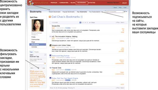Функция Dogear (рис. 5) позволяет пользователям сохранять закладки и совместно их использовать. Закладки общего пользования (social bookmarking) представляют собой удобное средство хранения и обмена информацией. Dogear переносит эти возможности в корпоративную среду, поддерживая такие функции, как коллективное использование ранее оцененной информации.