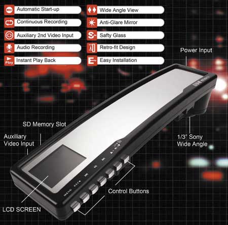 В заключение хотелось бы упомянуть о наиболее элегантном решении — удобном для применения в автомобиле специализированном видеорегистраторе, который встроен в зеркало заднего вида (вместе с видеокамерой, 2,5-дюймовым ЖК-монитором, отсеком для SD-карты и кнопками управления), который продается в США за 400 долл. (http://www.brickhousesecurity.com/car-camera-recorder.html). Простота установки (его надо всего лишь установить вместо штатного зеркала заднего вида) и использования делает его наиболее привлекательным устройством такого типа. Видео пишется на флэш-карточку формата SecureDigital, имеется вход для дополнительной видеокамеры (которую можно применять, например, в качестве камеры заднего вида для облегчения парковки). Кроме того, у данного устройства есть USB-разъем для настройки и скачивания видео на другой носитель.