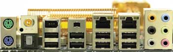 Кроме упомянутых потов FireWire, на выходной панели материнской платы можно найти два разъема PS/2 (для подключения клавиатуры и мыши), два сетевых разъема RJ-45, восемь портов USB, а также набор аудиоразъемов: цифровой и коаксиальный оптические S/PDIF-разъемы и шесть mini-jack-разъемов (Line In/Line Out/MIC In/Surround Speaker Out (Rear Speaker Out)/Center/Subwoofer Speaker Out/Side Speaker Out) — рис. 2. Кстати говоря, если у пользователя возникнет необходимость в использовании COM- или LPT-порта, то и эти уже сходящие со сцены интерфейсы можно будет реализовать с помощью дополнительных планок расширения, подключив их к соответствующим разъемам, оборудованным на плате.