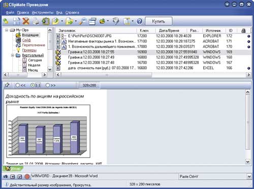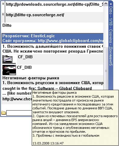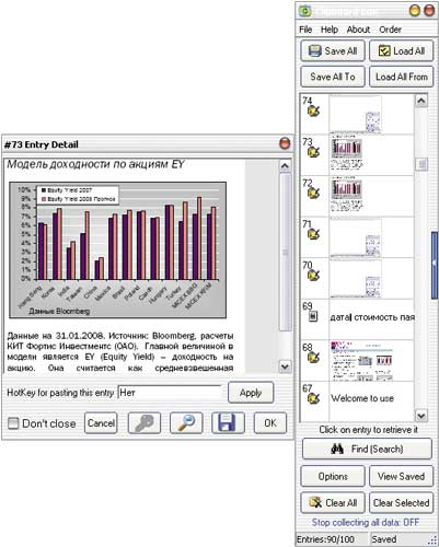 Любой из записанных фрагментов может быть просмотрен в увеличенном виде и вставлен в документ через системный трей или при активировании его и нажатии комбинации клавиш Ctrl+D либо соответствующей кнопки в окне программы.