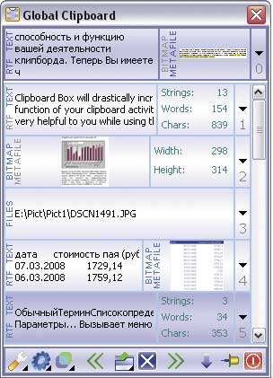 Global Clipboard — удобный в работе менеджер буфера обмена, позволяющий восстанавливать из буфера изображения, тексты (в том числе с форматированием) и имена скопированных файлов и папок. По умолчанию утилита может хранить до 20 фрагментов (при желании допускается увеличение числа запоминаемых фрагментов до 1000), однако количество активных фрагментов (то есть тех, к которым возможен мгновенный доступ) ограничено пятью. Вместе с тем при необходимости можно перемещаться между сохраненными фрагментами и менять их местами, что открывает быстрый доступ к другим имеющимся в базе блокам информации.