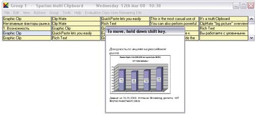 Spartan Multi Clipboard — утилита для управления буфером обмена, позволяющая восстанавливать из него текстовую и графическую информацию. Она может хранить до 150 фрагментов данных, но активными являются лишь последние 25 (они отображаются в верхней части окна программы), а любой из остальных может быть извлечен из раздела Clipboard программы путем копирования. Отдельные фрагменты для дальнейшего использования несложно перенести в конкретные группы (всего предусмотрено применение 20 групп), информация в которых автоматически сохраняется на диске и не перезаписывается.