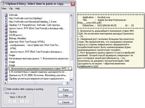 Clipdiary — очень простая и удобная в использовании программа для восстановления ранее скопированной в буфер обмена текстовой (в том числе с форматированием) и графической информации. Она умеет распознавать одинаковые фрагменты и позволяет восстанавливать до 200 сохраненных в буфере обмена текстовых блоков и изображений.