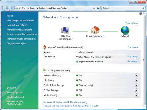 В правой части окна Network and Sharing Center (рис. 1) отображаются статус и свойства подключения компьютера к Интернету и локальной сети, а в левой — панель задач (Tasks) со ссылками на другие диалоговые окна, относящиеся к настройкам, управлению, просмотру и диагностике сетевых соединений.