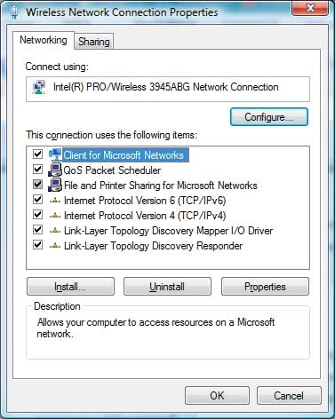 Для настройки беспроводного адаптера выберите в окне Manage wireless networks на панели задач пункт Adapter Properties (Свойства адаптера). При этом откроется окно настроек беспроводного сетевого адаптера Wireless Network Connections Properties. Перейдя к пункту Internet Protocol Version 4 (TCP/IPv4) (Протокол Интернета версии 4 (TCP/IPv4)) и нажав на кнопку Properties (Свойства), попадаем в стандартное окно, в котором можно задать IP-адрес беспроводного сетевого адаптера, маску подсети, IP-адрес основного шлюза, а также IP-адреса первичного и вторичного DNS-серверов.