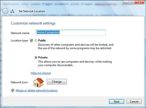После подключения компьютера к локальной сети в окне Центр управления сетями и общим доступом можно будет произвести дополнительные настройки сетевого соединения. Для этого на панели задач необходимо выбрать ссылку Customize (Настройка) напротив имени локальной сети. В открывшемся окне Set Network Locations (Настройка сетевого размещения) (рис. 5) можно указать название созданного сетевого соединения, выбрать значок для этого соединения и тип размещения сети (Public (Общественное) или Private (Частное)). Что касается домашней сети, то лучше установить тип размещения Private, поскольку это позволит вашему компьютеру обнаруживать другие компьютеры и устройства в составе локальной сети и сделает для них возможным обнаружение вашего компьютера. Для публичной сети (например, если речь идет о беспроводном хот-споте) лучше выбрать тип размещения Public. В этом случае будет ограничено обнаружение компьютеров в сети, а также использование сети некоторыми программами.