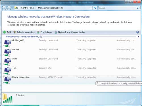 Следующая функция, предусмотренная Network and Sharing Center, — это возможность выбора локальной сети, к которой требуется подключиться. Она важна в том случае, когда имеется несколько беспроводных локальных сетей.
