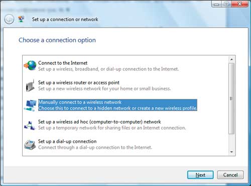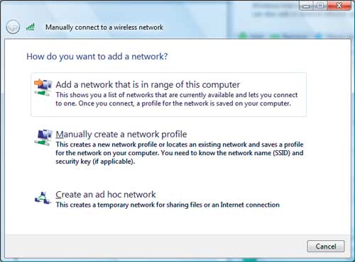 После настройки беспроводного сетевого адаптера можно приступать к созданию нового профиля беспроводного соединения. Для этого в окне Manage wireless networks на панели задач выберите пункт Add (Добавить). После этого откроется диалоговое окно Manually connect to a wireless network (Подключение к беспроводной сети вручную) — рис. 7, предлагающее три варианта создания профиля беспроводного соединения: