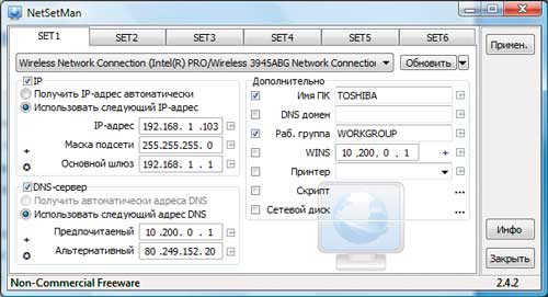 NetSetMan 2.4.2 — это небольшая бесплатная утилита с простым и интуитивно понятным интерфейсом. Она совместима с операционной системой Windows Vista и поддерживает несколько интерфейсных языков, в том числе русский, так что освоить ее не составит труда. Данная утилита дает возможность создать шесть различных настроек (профилей) сетевого интерфейса и легко переключаться между ними. При этом можно выбирать любой сетевой интерфейс, присутствующий в ПК, для которого производится настройка. Собственно, шести различных настроек сетевых интерфейсов вполне достаточно. Довольно трудно представить себе ситуацию, когда их может потребоваться больше. Если кому-то нужно больше профилей, то можно только посочувствовать.