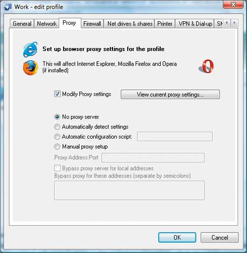 Естественно, сетевой профиль можно создавать и вручную. Кроме стандартных возможностей задания типа IP-адресации и IP-адреса, маски подсети, IP-адреса шлюза, DNS- и WINS-серверов для любого (проводного и беспроводного) сетевого интерфейса, можно определить для каждого профиля сетевой принтер, создать сетевые диски, указать тип используемого по умолчанию браузера и задать настройки прокси-сервера (поддерживается ISA-сервер) — рис. 15.