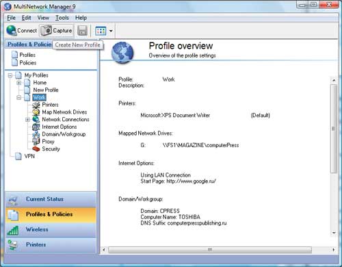 Итак, данная утилита позволяет создавать неограниченное число профилей сетевых подключений. Для создания сетевого профиля достаточно настроиться на работу в конкретной сети и нажать всего одну кнопку.