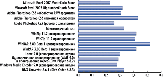 Для тестирования мы использовали методику, которую традиционно применяем для тестирования компьютеров и процессоров и которая неоднократно описывалась на страницах нашего журнала. Однако со времени последнего тестирования наш скрипт, используемый для тестирования компьютеров, претерпел небольшие изменения. Во-первых, были обновлены некоторые приложения. В частности, применялась последняя (на момент проведения тестирования) версия кодека DivX — 6.8.3, последняя версия конвертора DivX — 6.6.1 и плеера DivX — 6.8.2, последняя версия приложения Main Concept Reference — v.1.1.1 и последняя версия архиватора WinRAR — 3.80 Beta 1. Кроме того, вместо архиватора 7-Zip 4.57 мы стали использовать архиватор WinZip 11.2 в режиме архивирования и разархивирования файлов. При архивировании данных применялись максимальная степень сжатия и 256-битное шифрование AES. Также для архиватора WinRAR — 3.80 Beta 1 мы стали использовать максимальную степень сжатия с размером словаря 2048 Мбайт и AES-шифрованием.